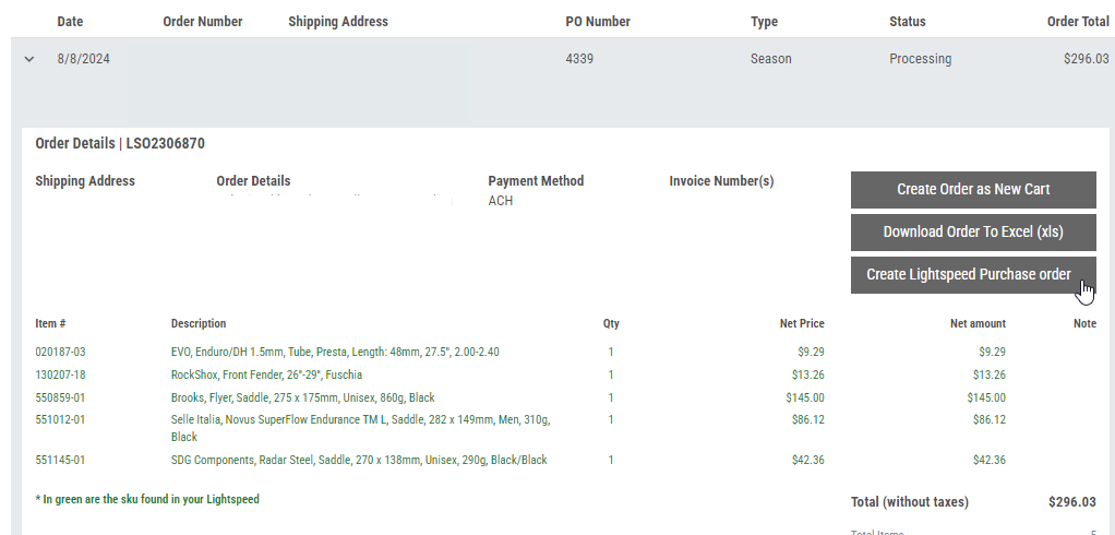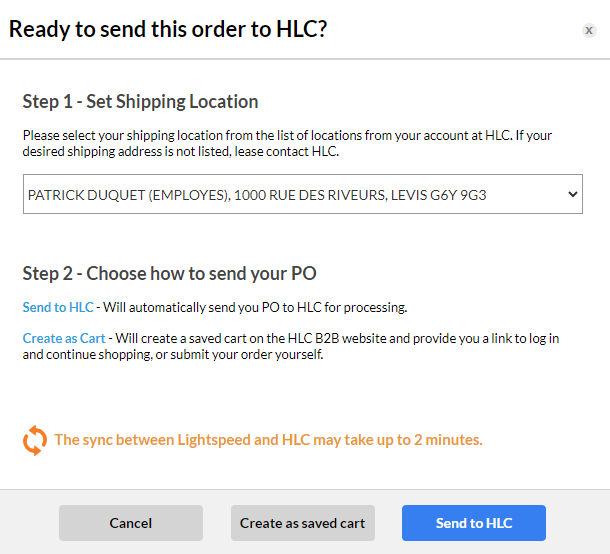 If you're starting your order on HLC's b2b, we can help you save time by creating your Lightspeed PO from our b2b. Once your POS is connected to HLC through the Lightspeed integration, you will see a new section at checkout called 'Lightspeed option'.